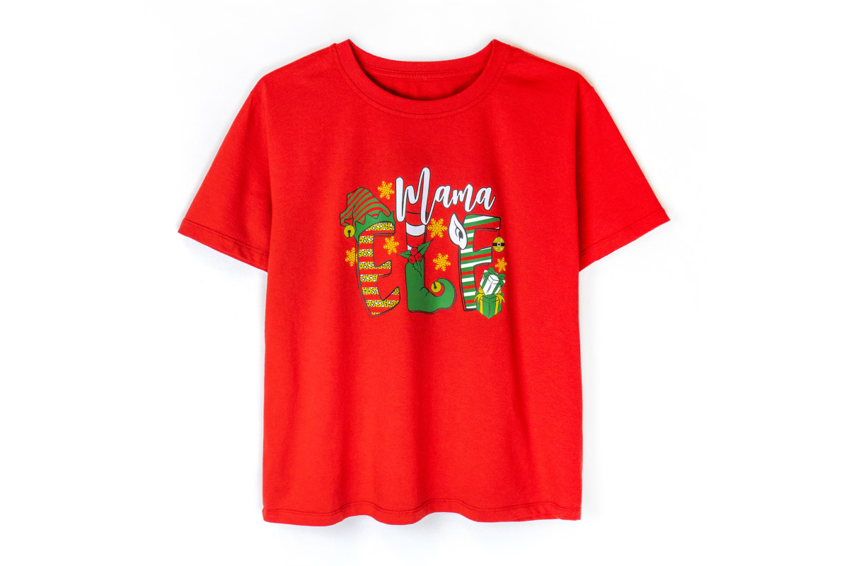 Футболка для женщин из кулира.Имеет расцветку красного цвета с ярким принтом "Mama Elf".Футболка сво..