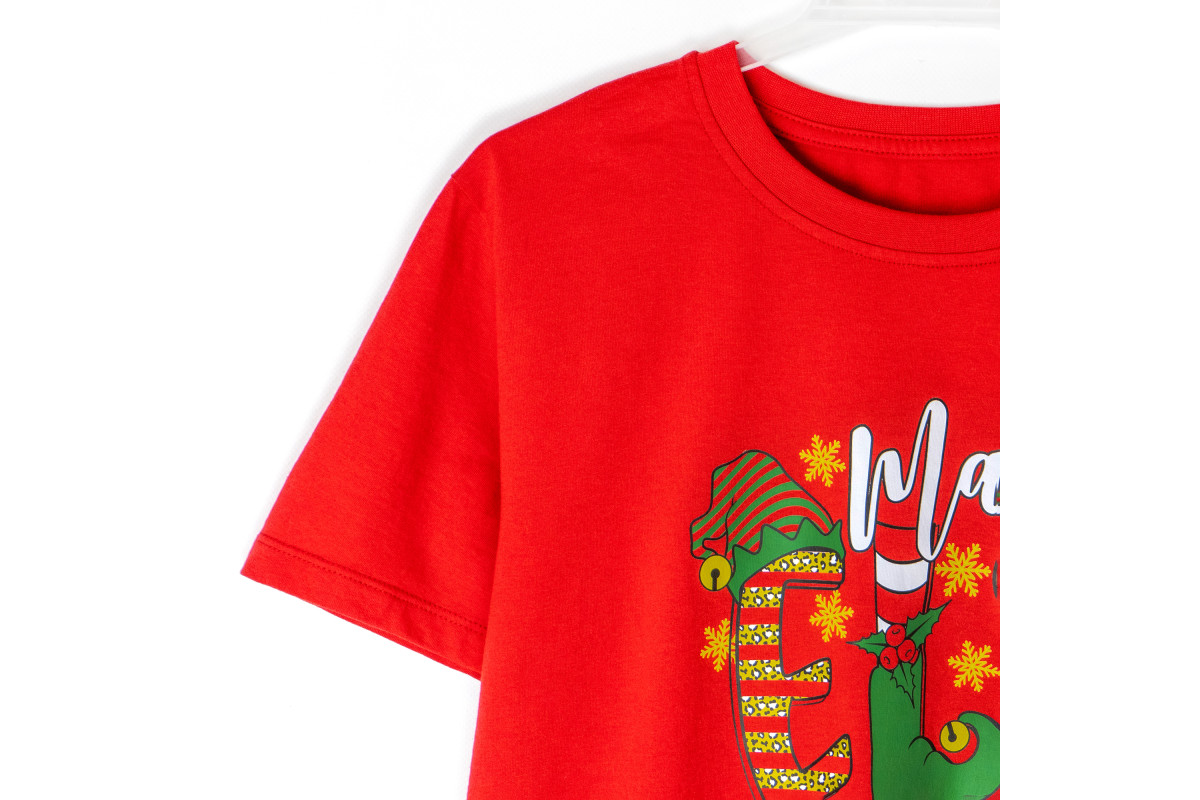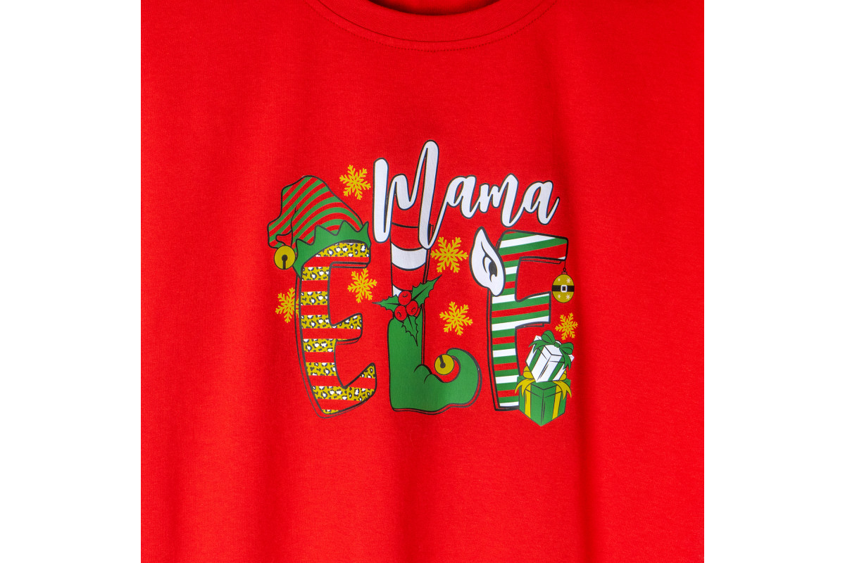 Має забарвлення червоного кольору з яскравим принтом "Mama Elf".