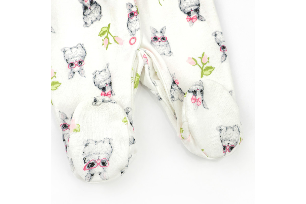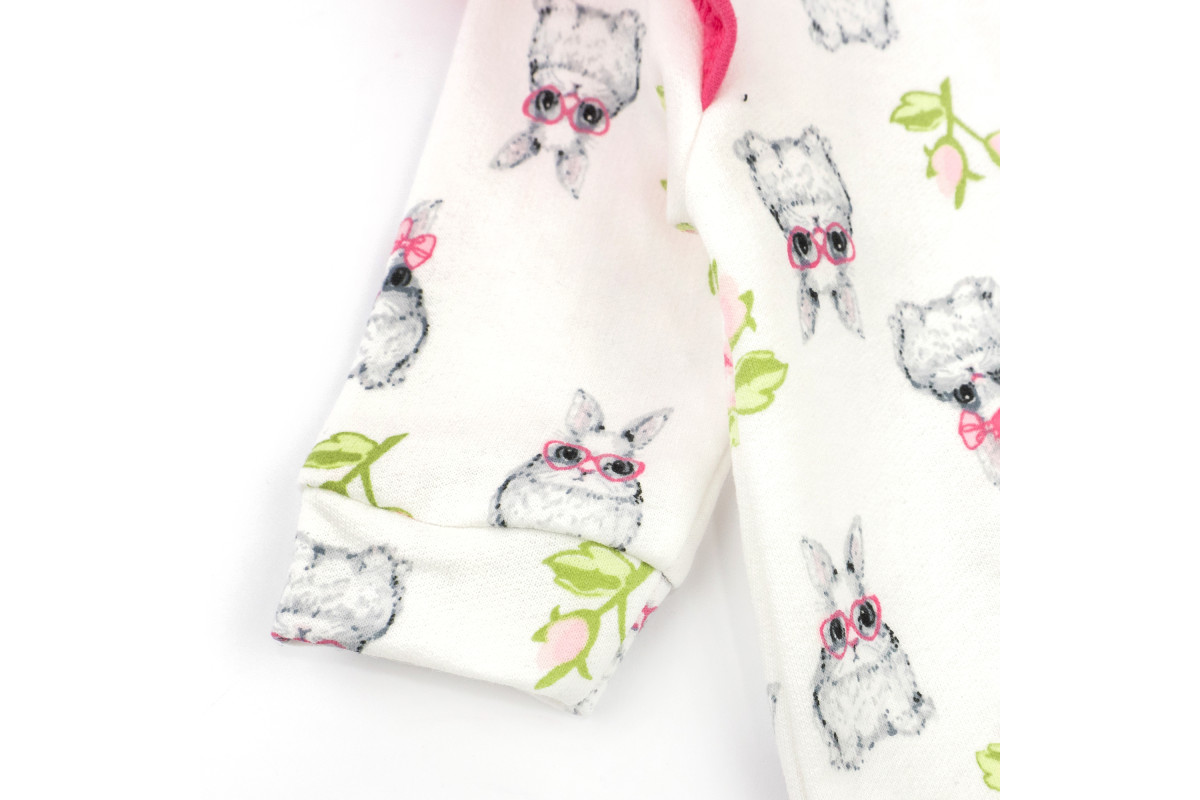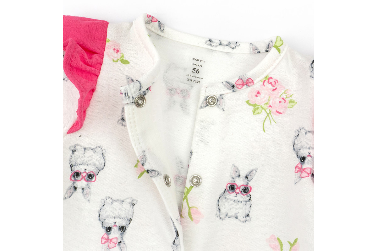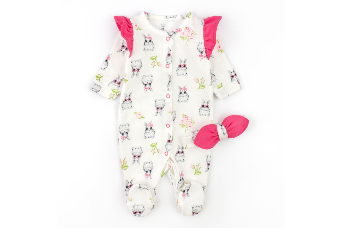 Чоловічок для дівчинки білого кольору з малиновими вставками із зайченятами.