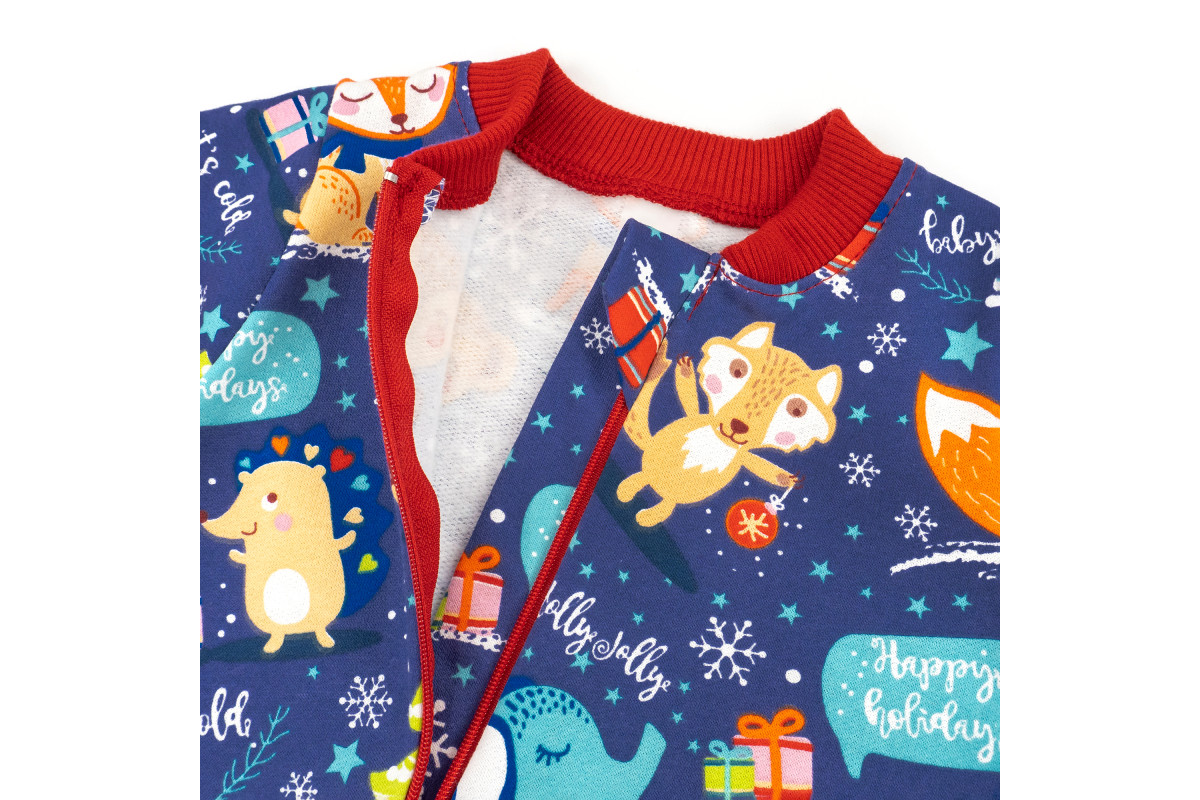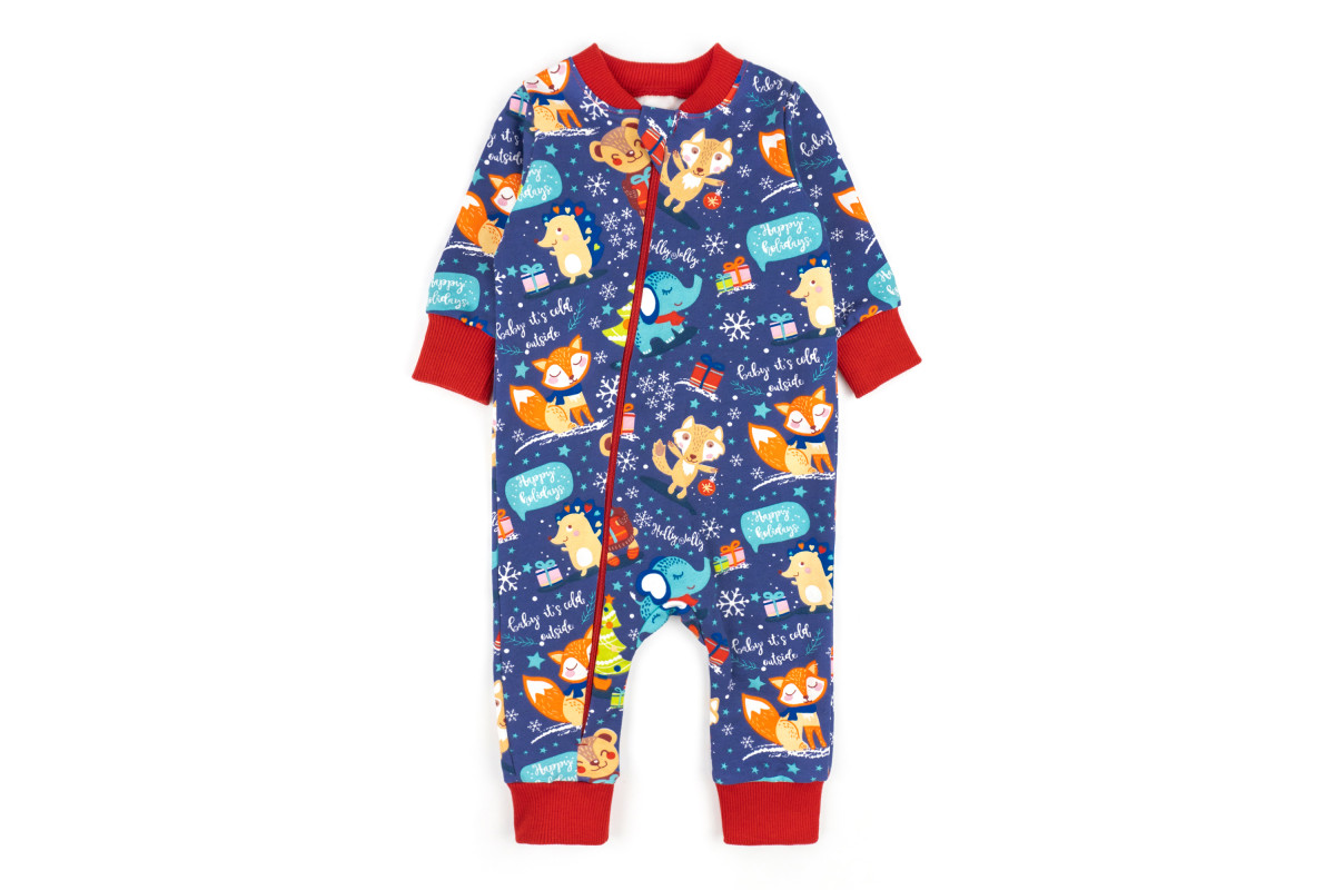 Комбез має яскраве святкове забарвлення синього кольору із звірятами. Таке забарвлення підійде як для хлопчика, так і для дівчинки.