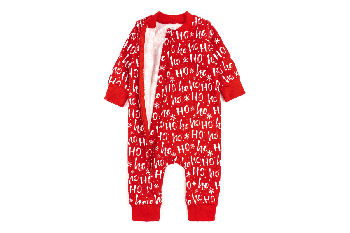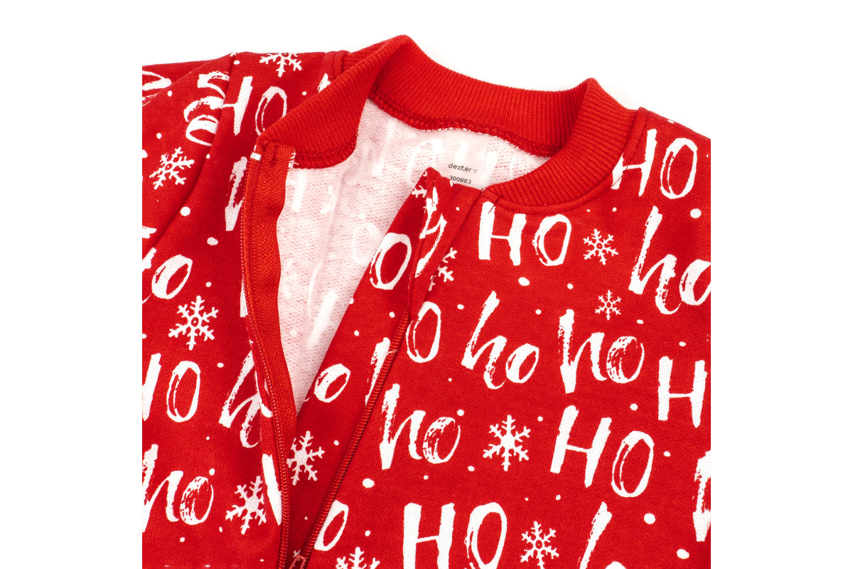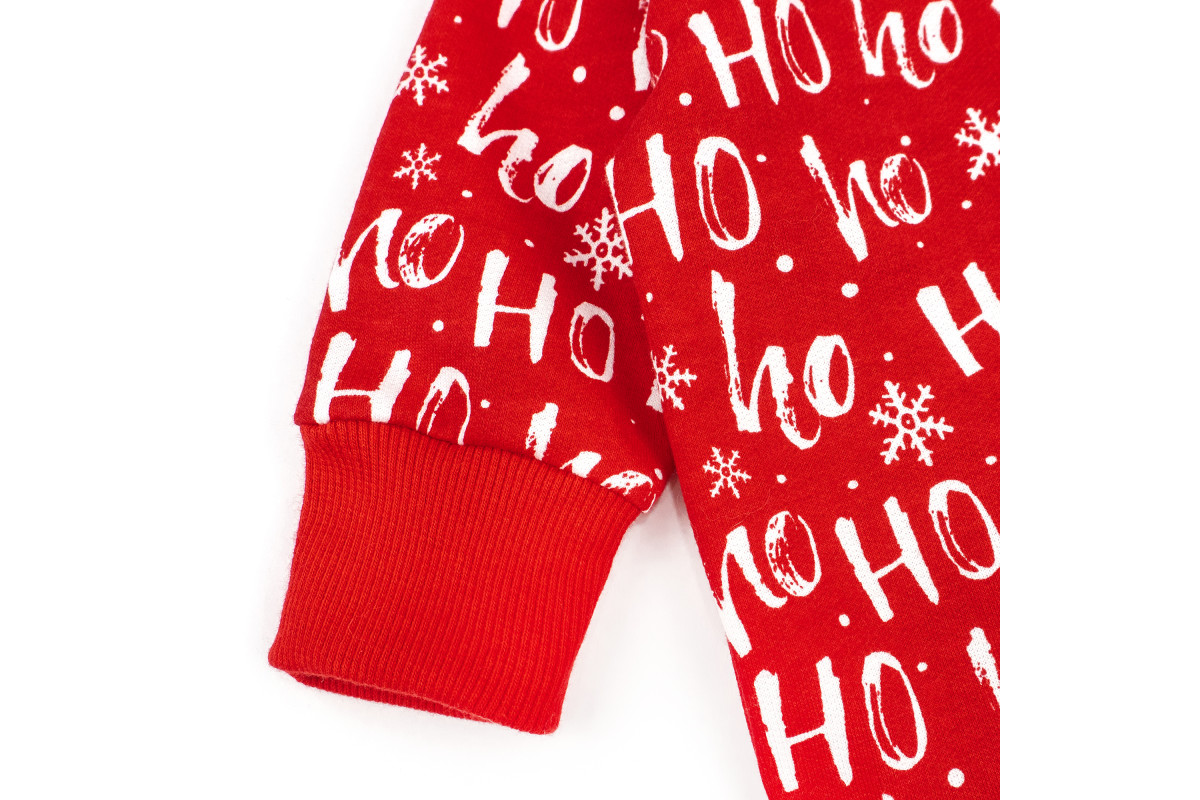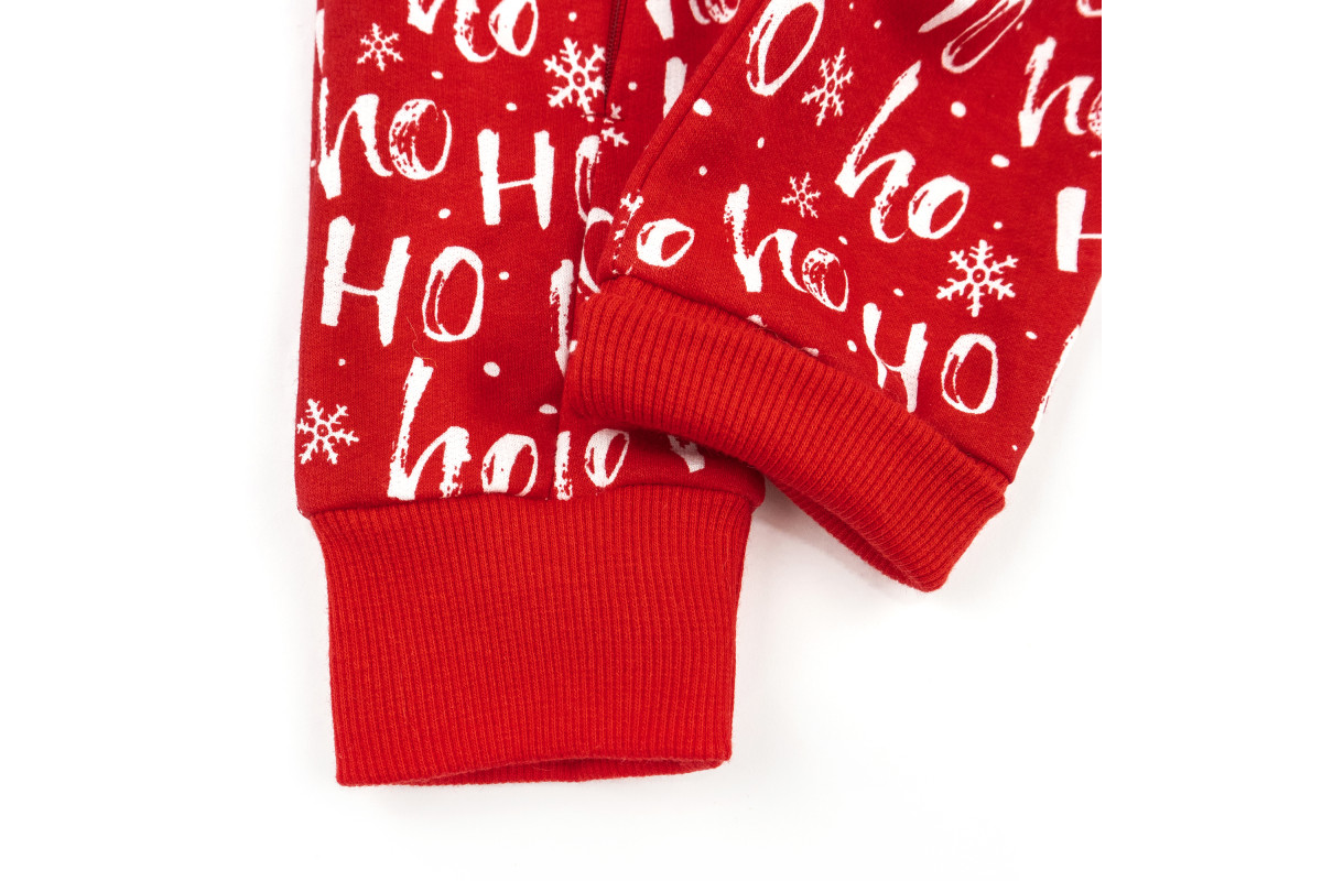 Комбез має забарвлення червоного кольору із новорічним написом. Манжети виготовлені з червоного рубчика в тон полотна. Забарвлення підійде як для дівчаток, так і для хлопчиків.