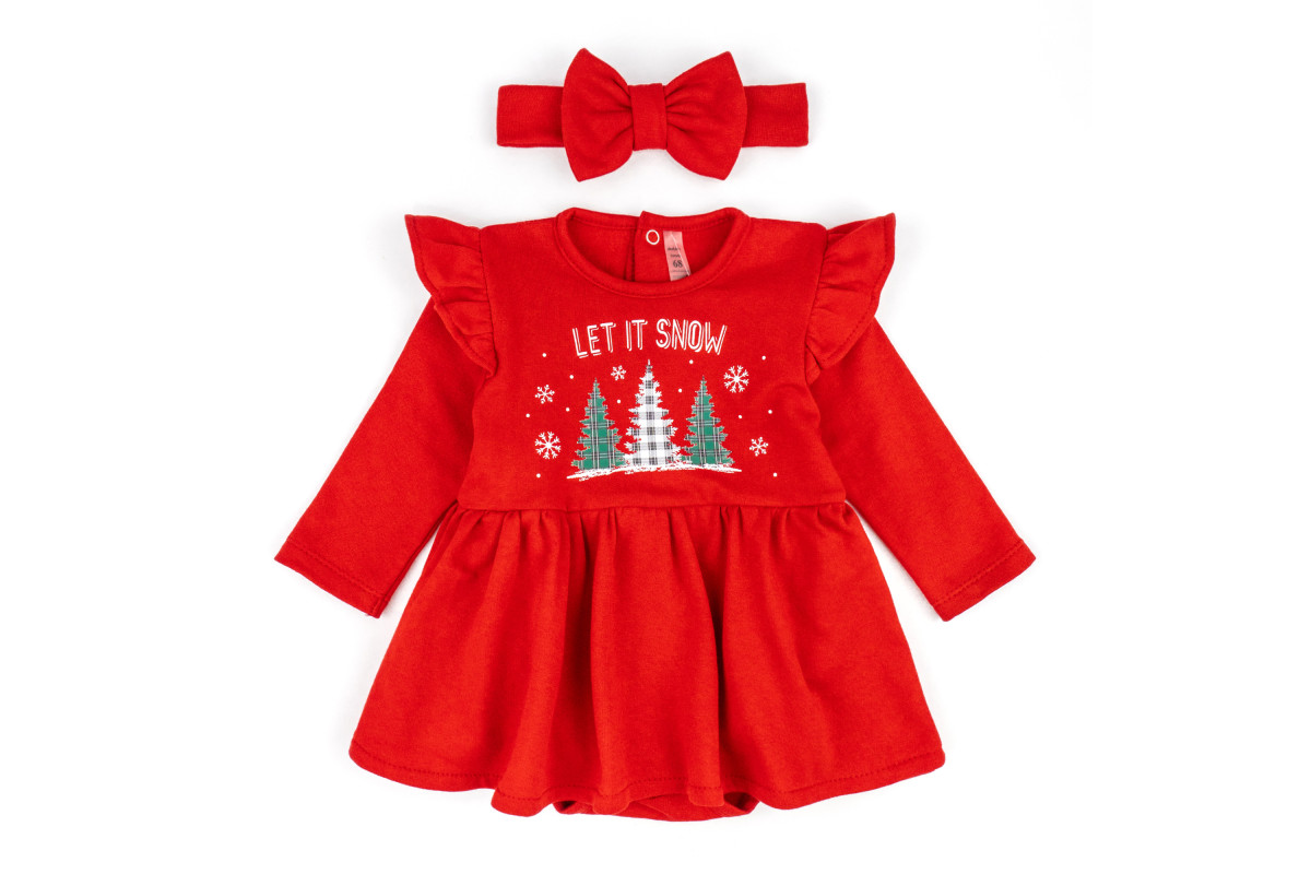 Боді у святковому забарвленні червоного кольору з яскравим принтом ялинок.