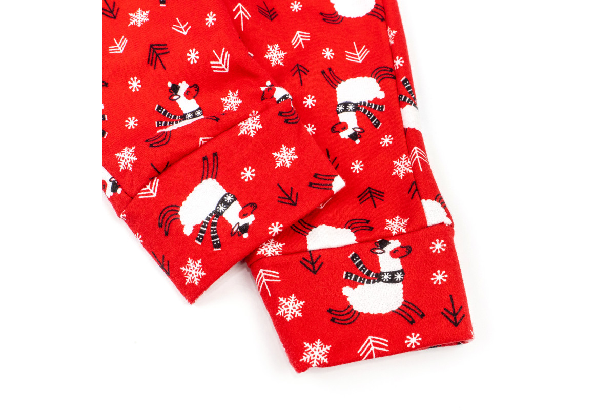 Піжама виконана в червоному забарвленні. На кофті яскравий принт з ламою.