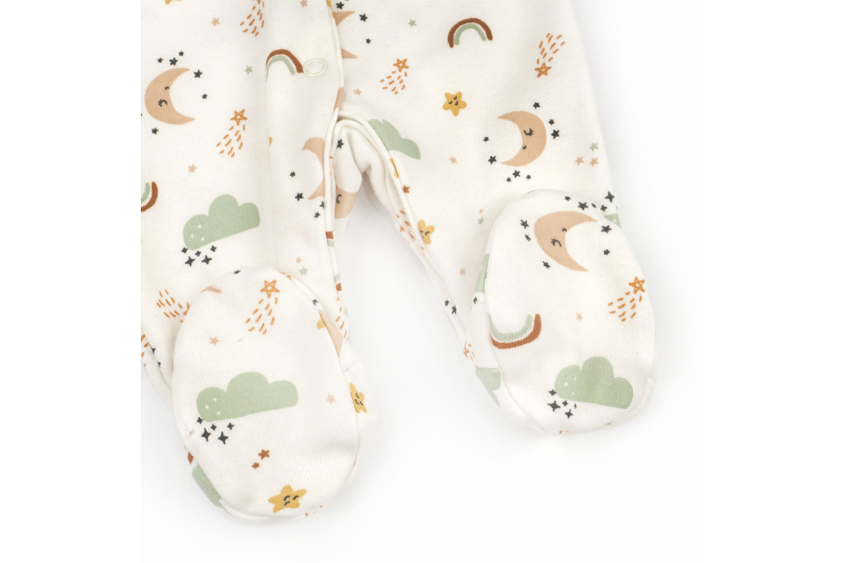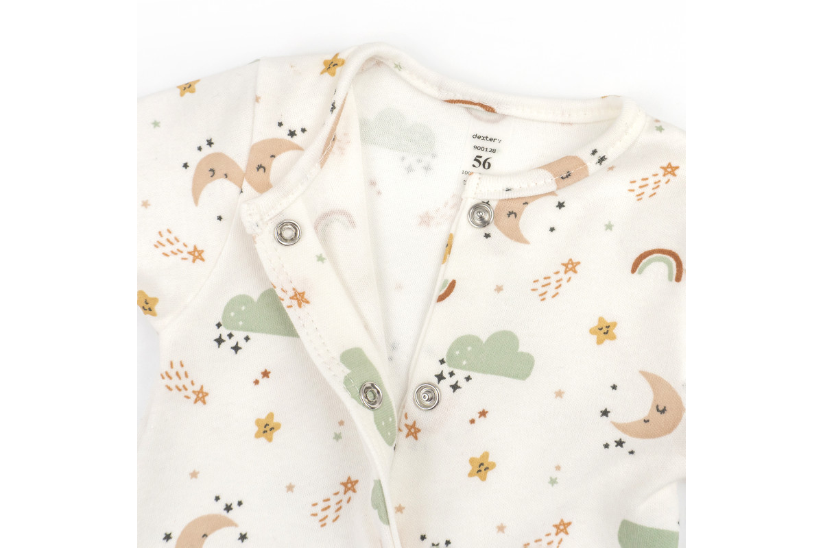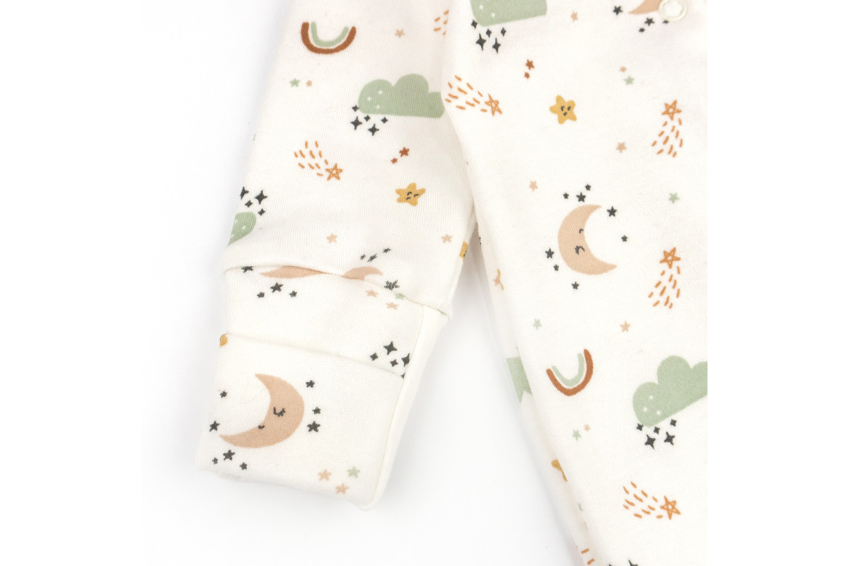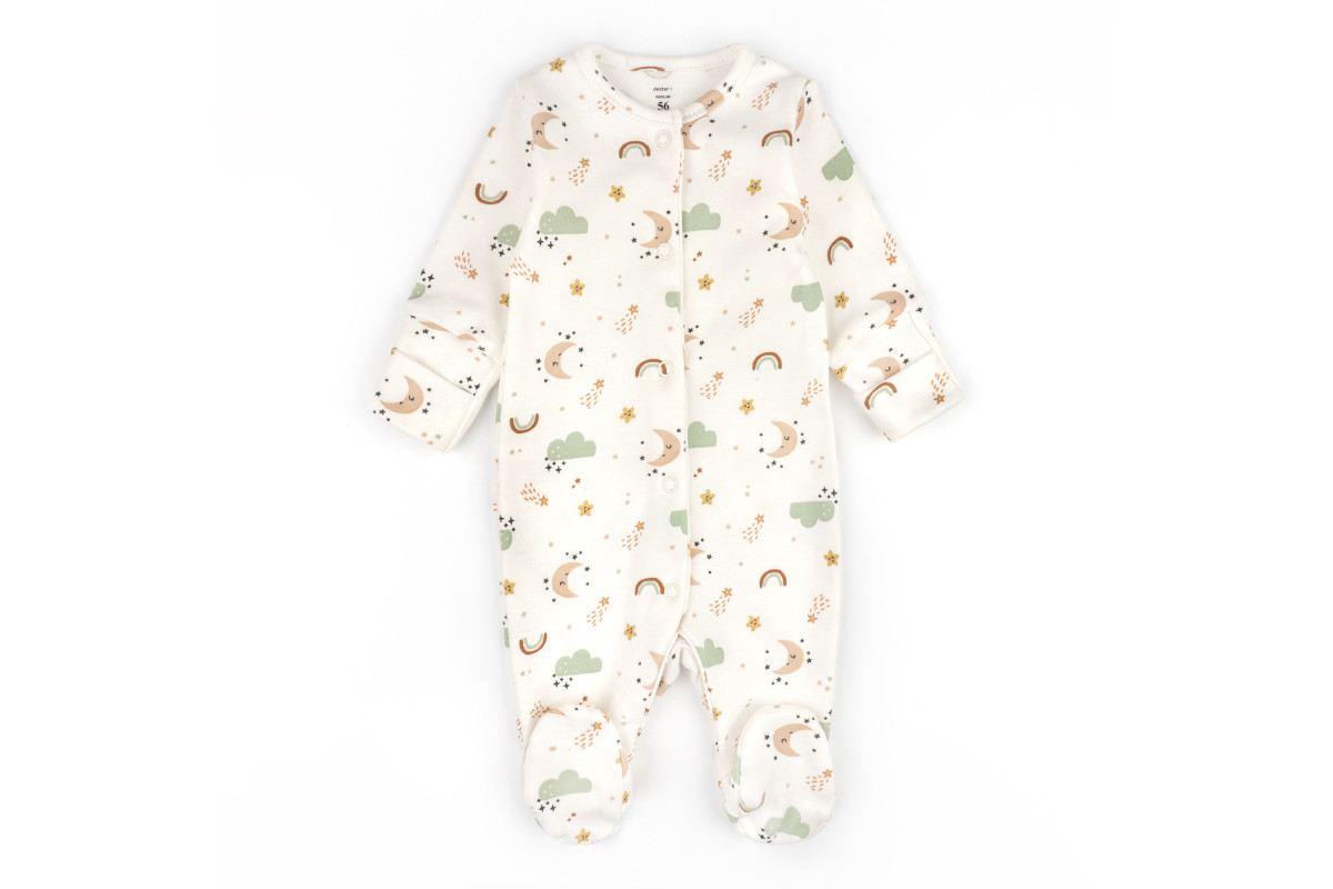 Комбез має забарвлення молочного кольору з місяцями, яке підійде і для хлопчика, і для дівчинки.