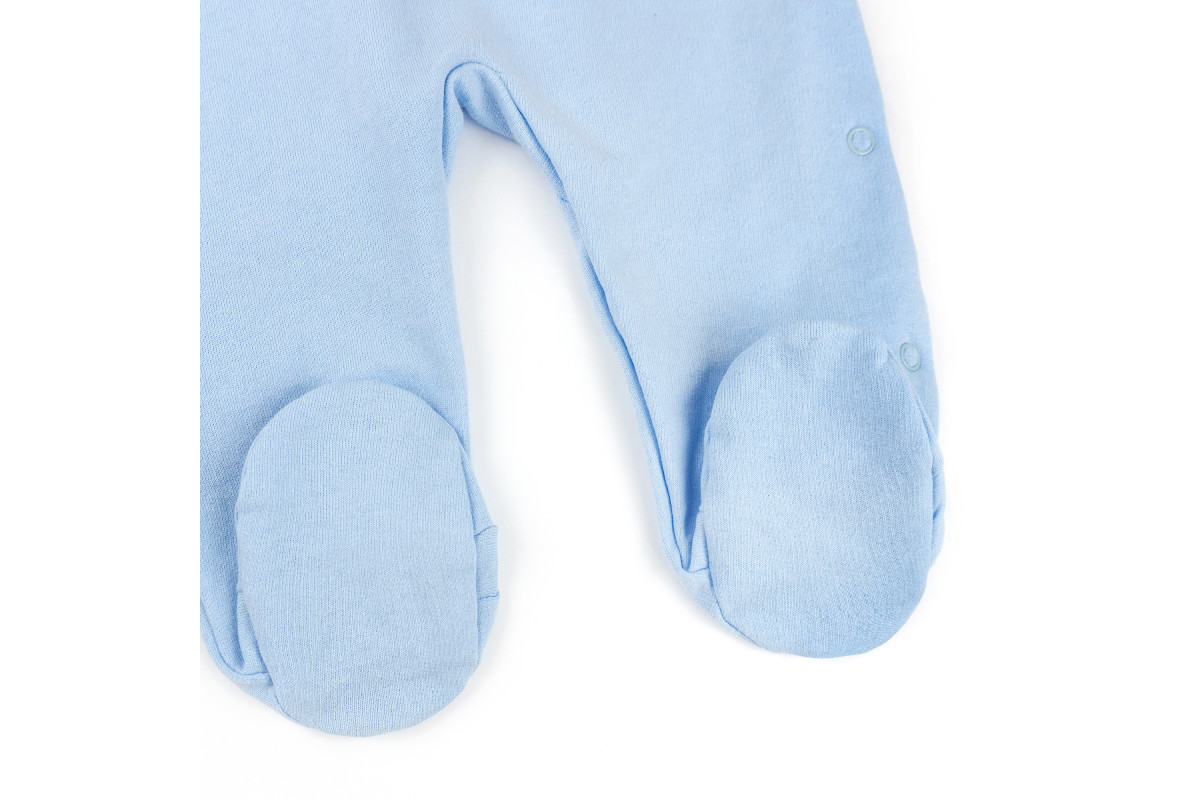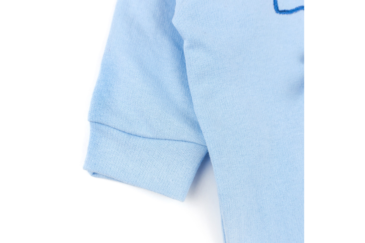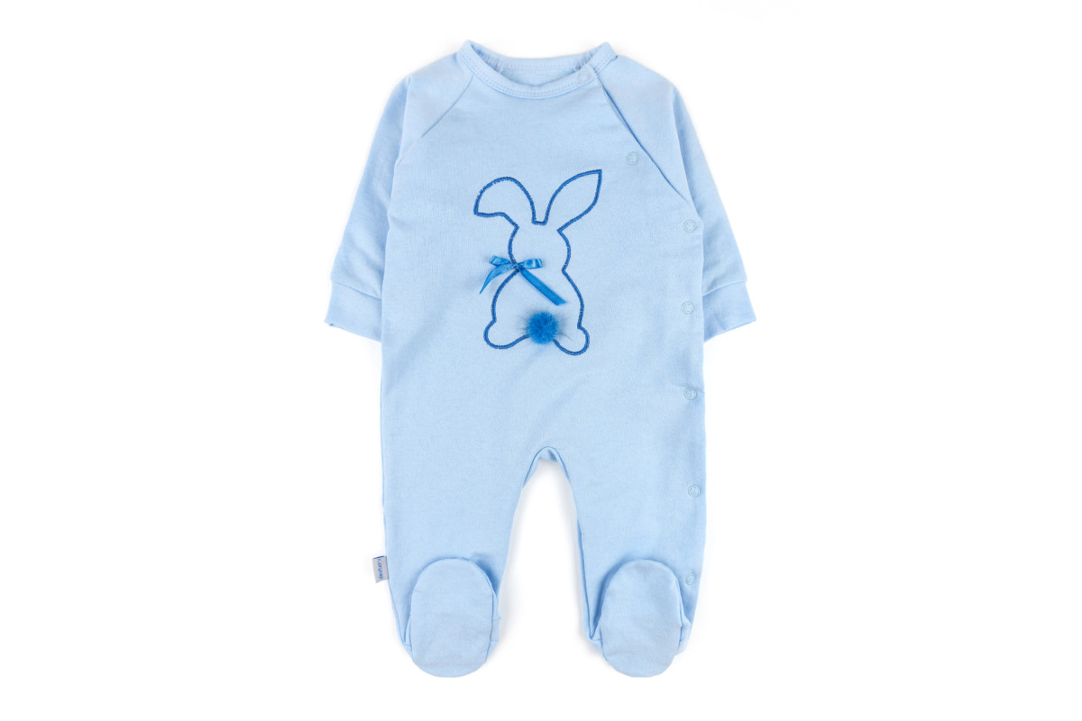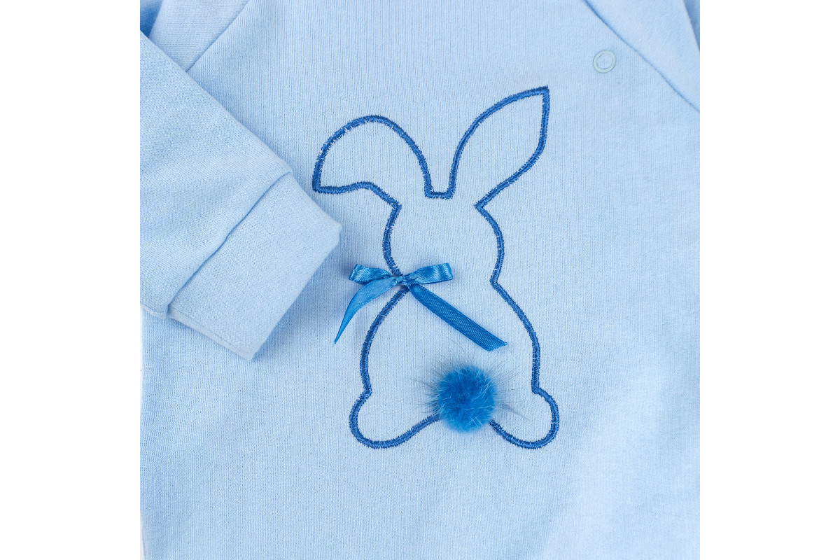 Чоловічок блакитного кольору, декорований вишивкою у вигляді зайчика з пухнастим хвостиком.
