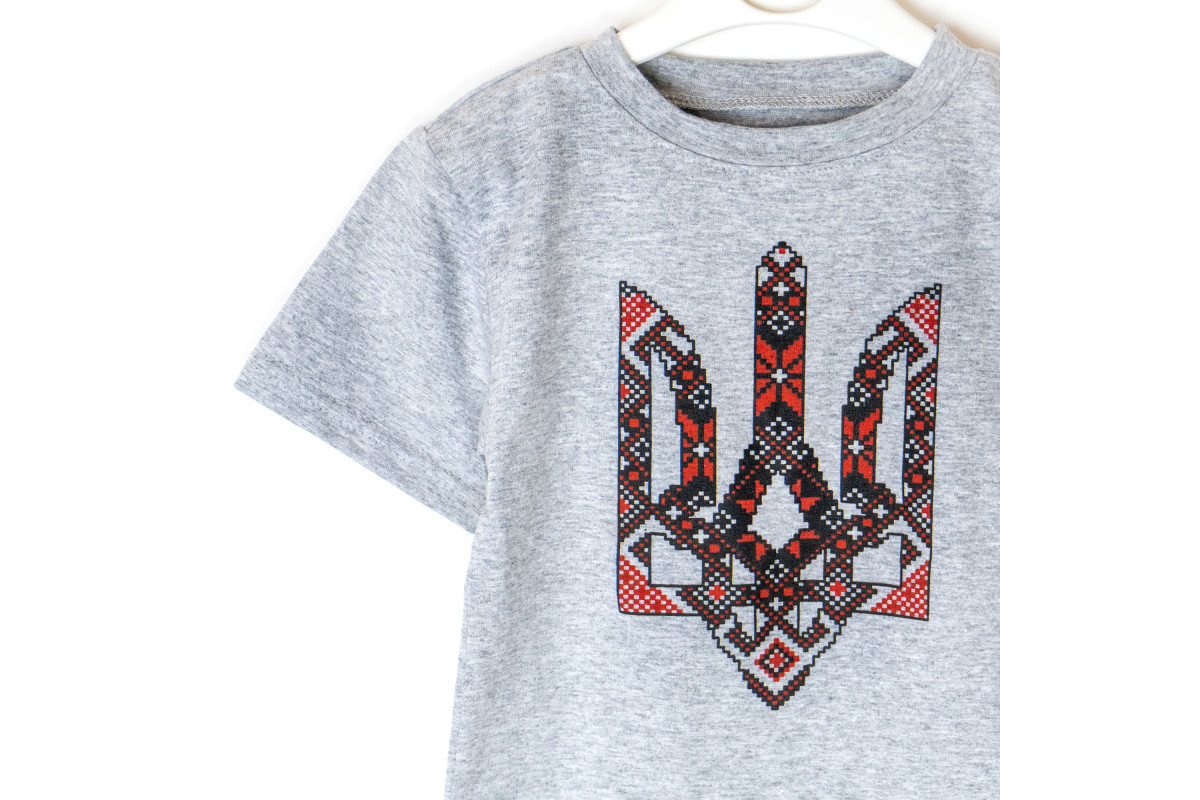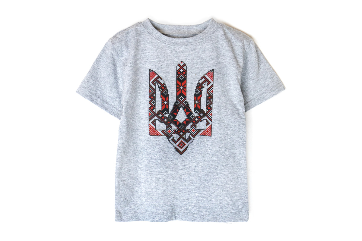 Детская футболка серого цвета с принтом в виде легендарной надписи "Доброго вечора ми з України".Тка..