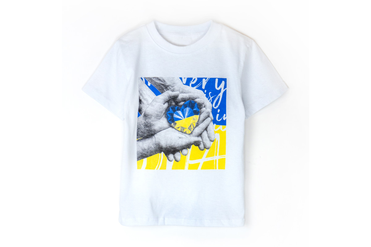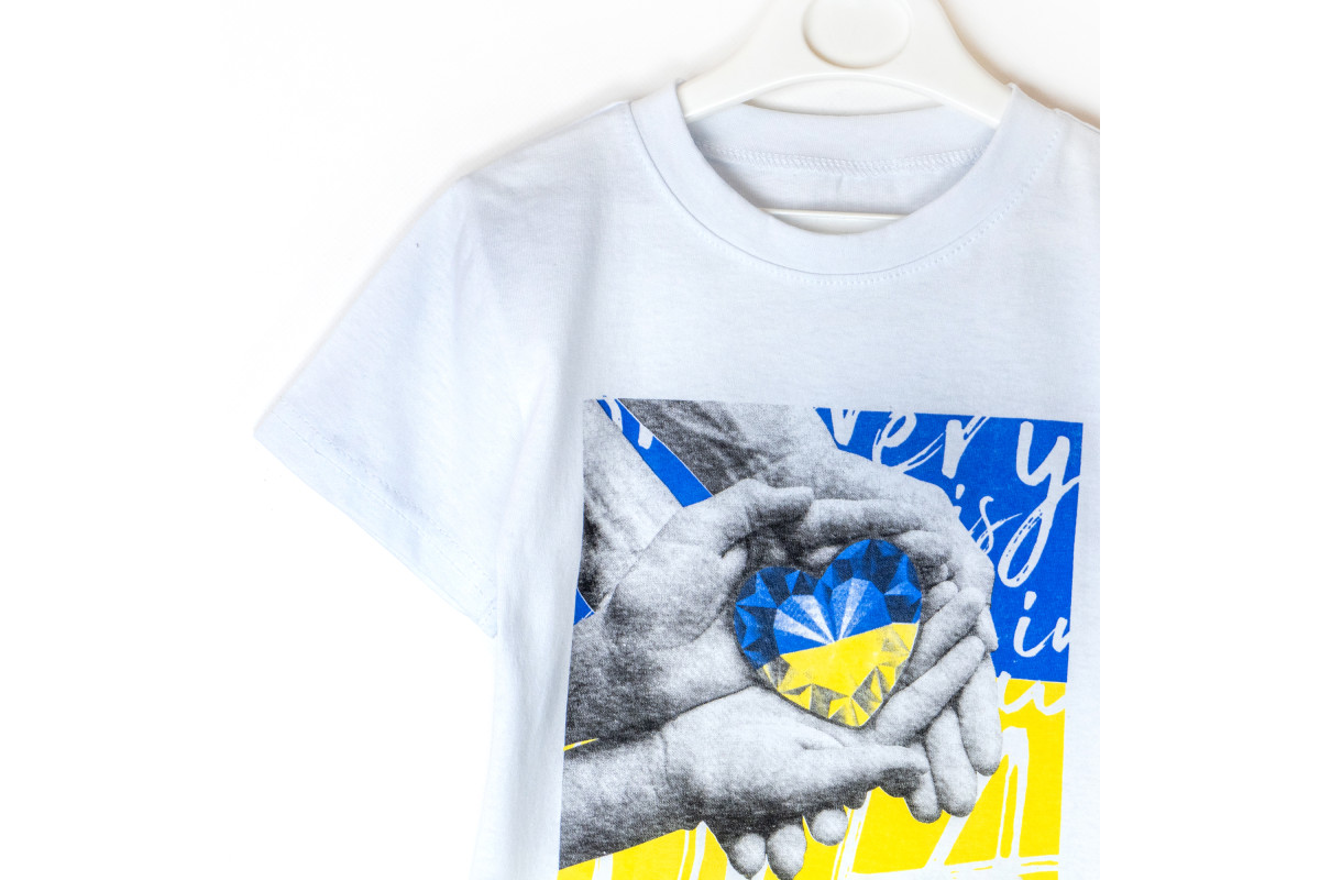 Дитяча футболка білого кольору із патріотичним принтом.