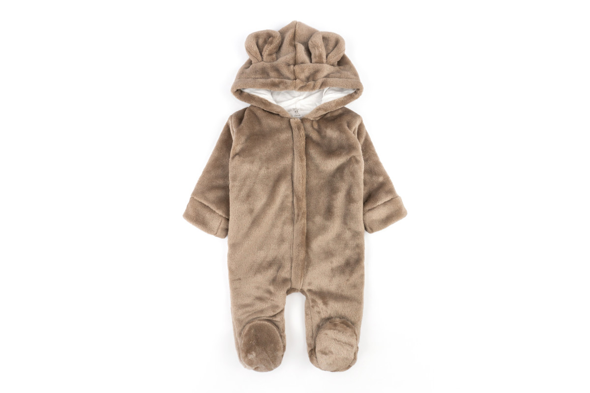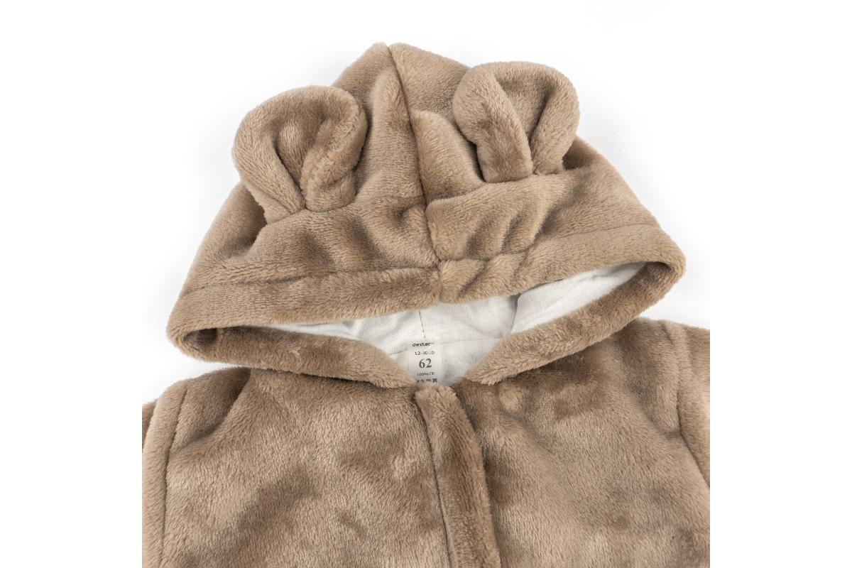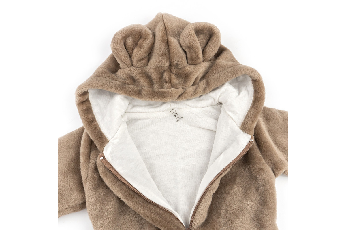 Комбінезон має милий дизайн - коричневий колір та капюшон з вушками робить його схожим на ведмедика. Комбінезон має відкриті рукави та закриті ніжки.