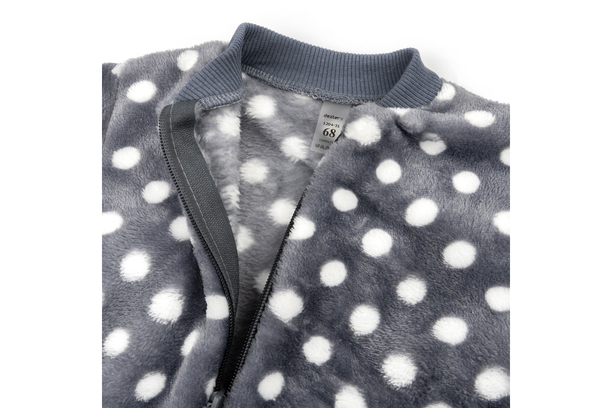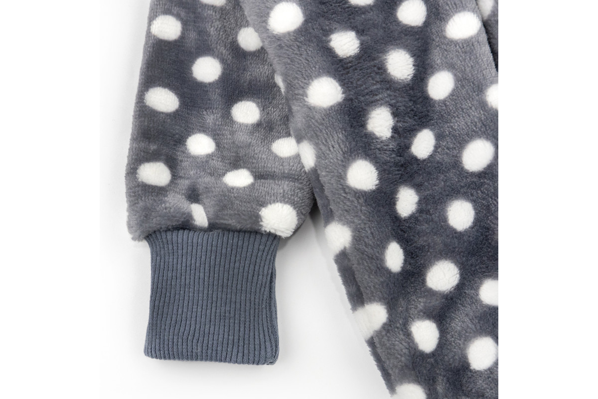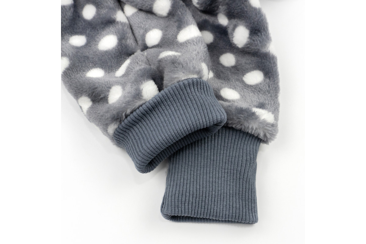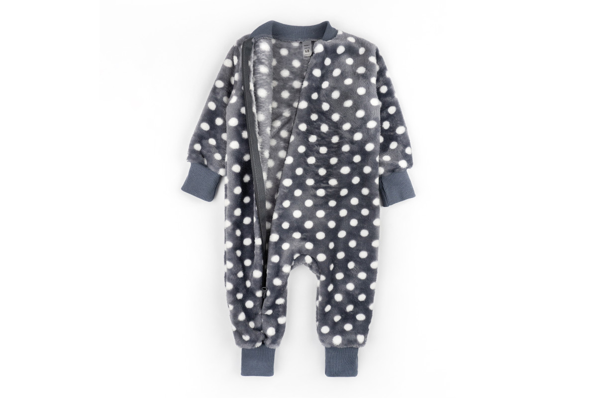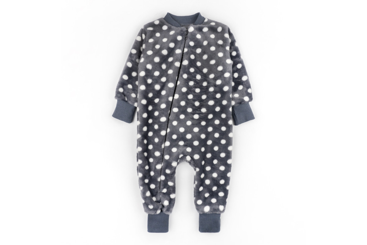 Комбінезон має забарвлення темно-сірого кольору в білий горох. Манжети темно-сірого кольору в тон. Підійде як для хлопчиків, так і для дівчаток.
