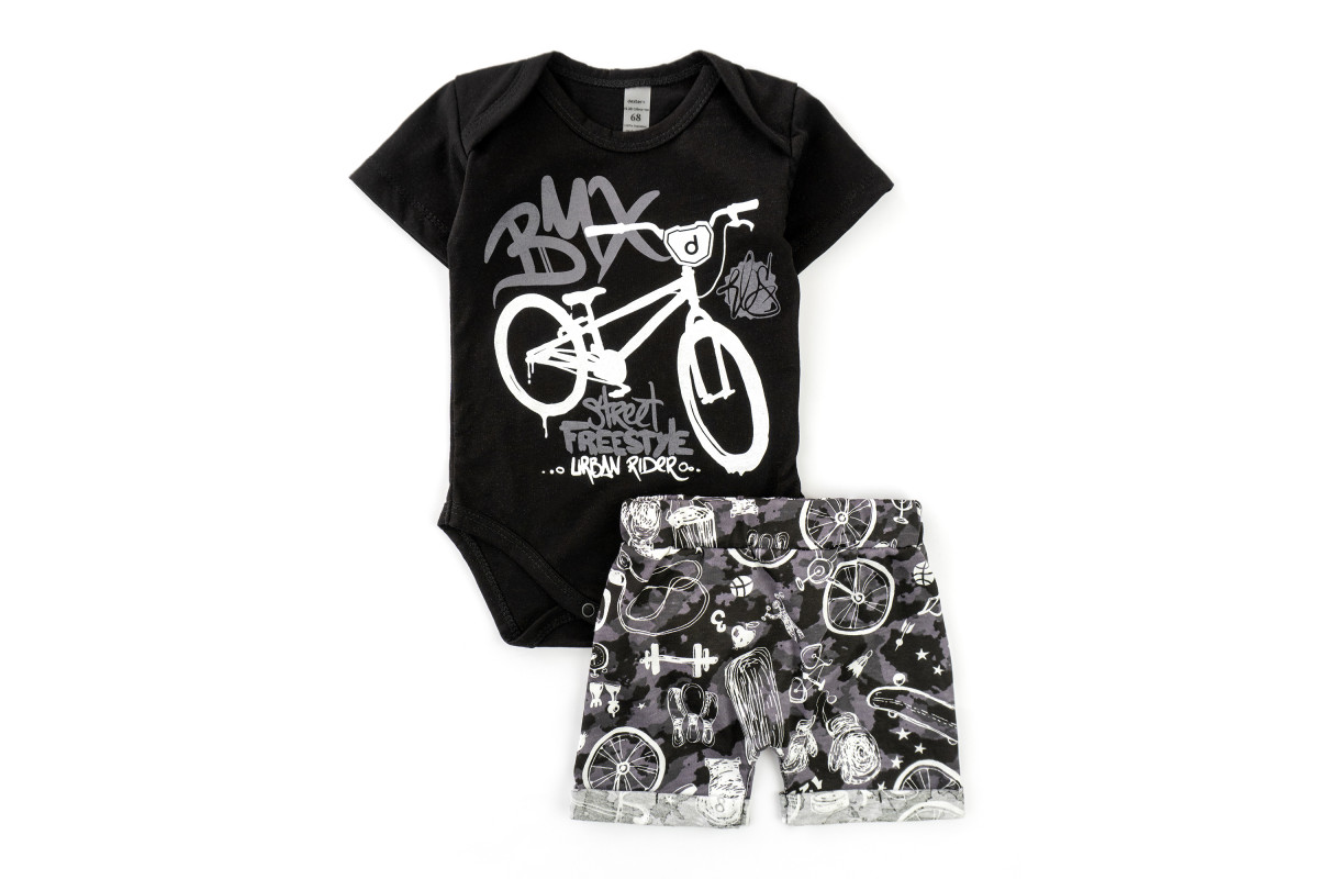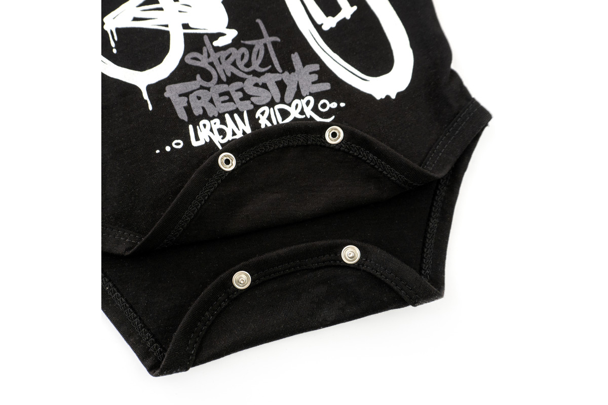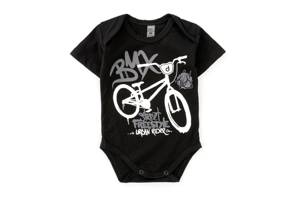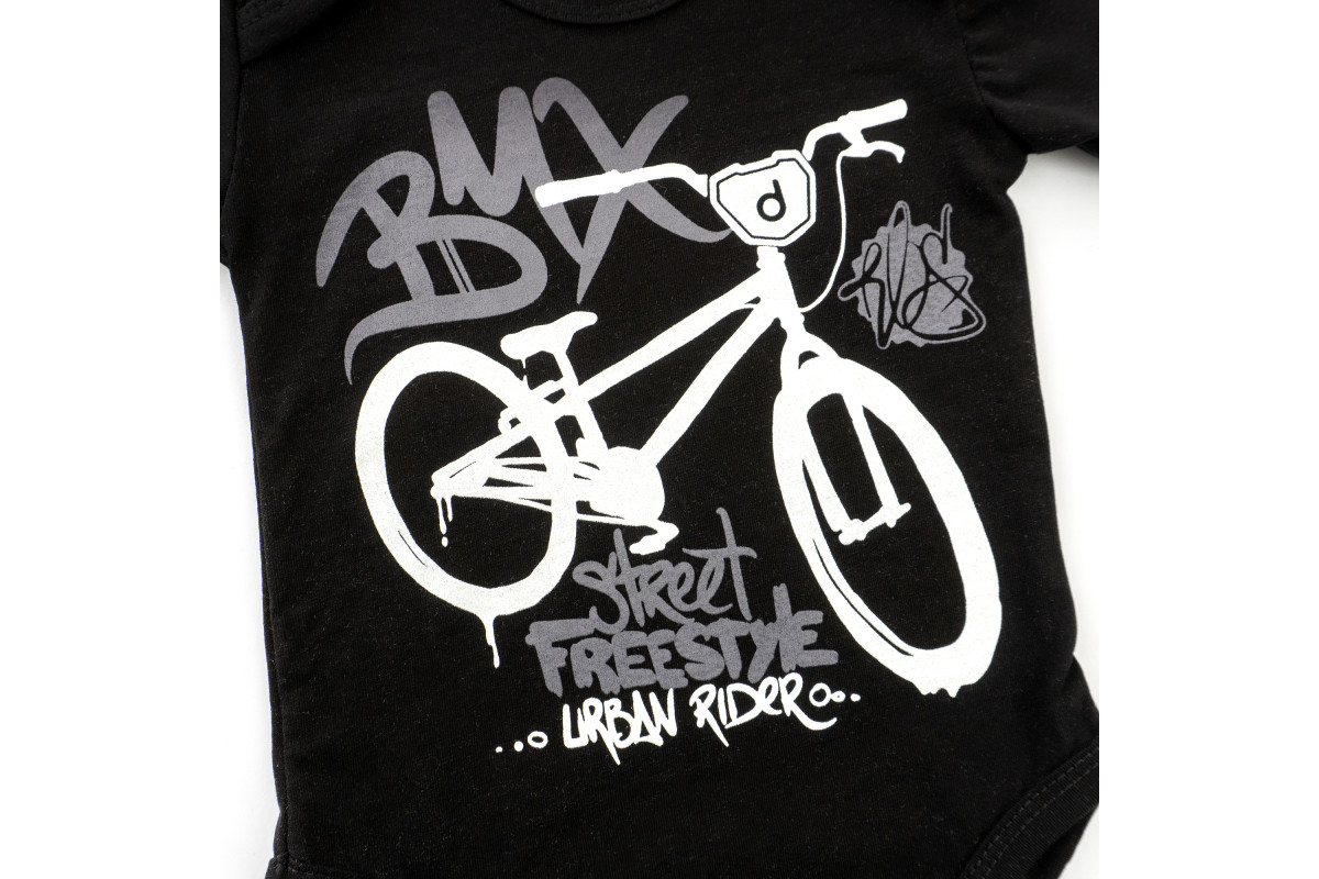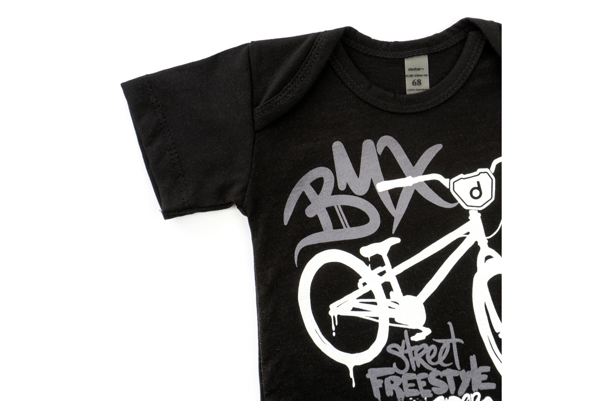Боді чорного кольору з коротким рукавом та вирізом "човник", прикрашений стильним принтом з велосипедом.