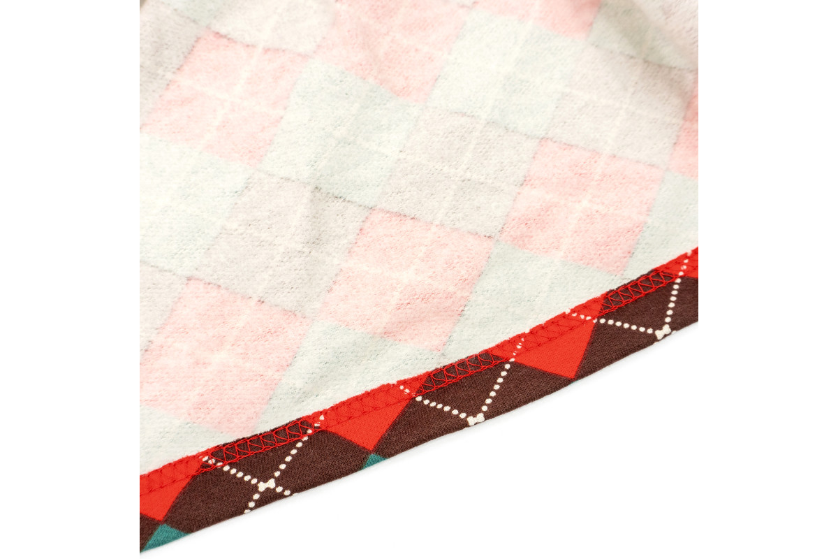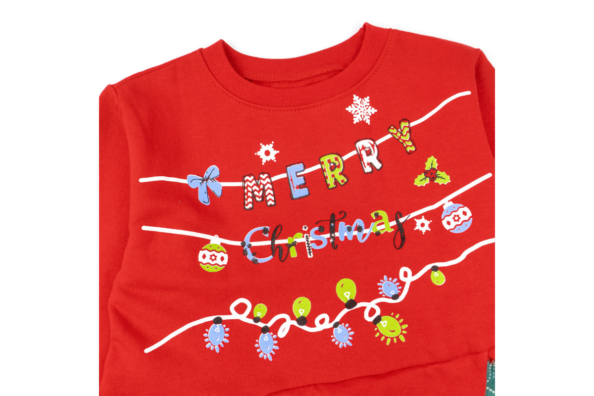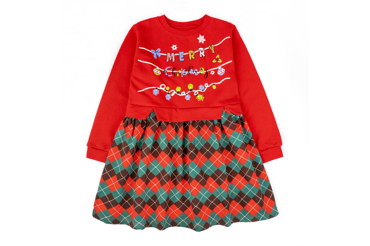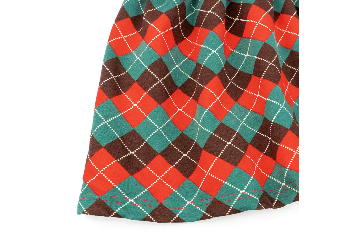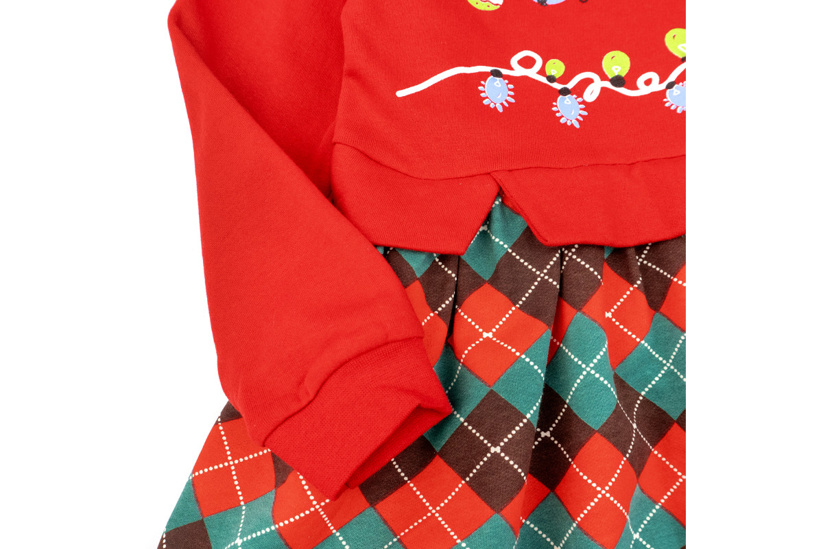 Сукня пошита із теплої тканини з начісом. Поділ сукні має різдвяне забарвлення у клітинку.